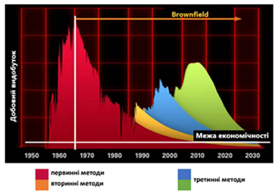 Експлуатація нафтогазових родовищ на пізній стадії розробки характеризується постійним поступовим падінням видобутку (використовується тільки природна енергія пласта, застосовуються первинні методи/primary recovery, кінцевий коефіцієнт нафтовіддачі до 20‐25% від геологічних запасів). Це переважно пов'язано з виснаженням запасів, зниженням пластового тиску та збільшенням обводненості продукції видобувних свердловин.